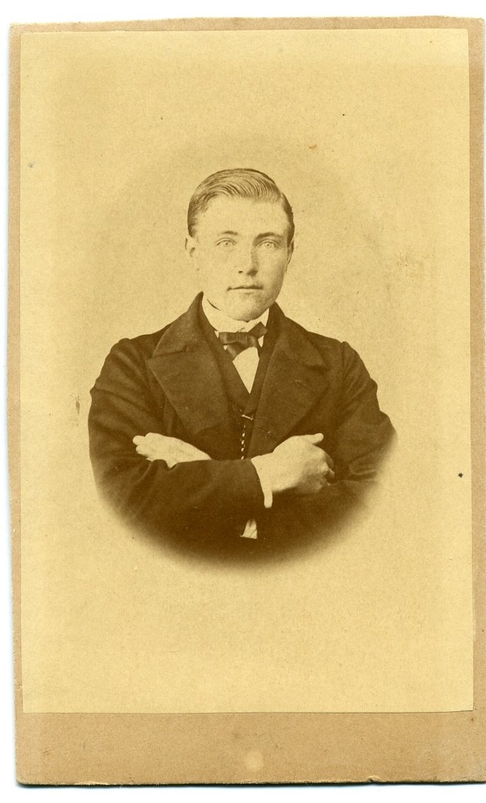 Kabinettsfotografi: bröstbild av okänd ung man med armarna i kors.