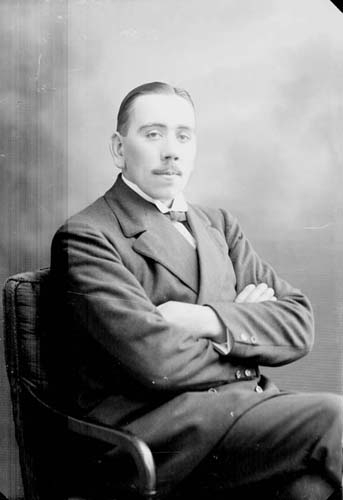 Porträtt av en man med mustasch som sitter i en fåtölj med armarna i kors.