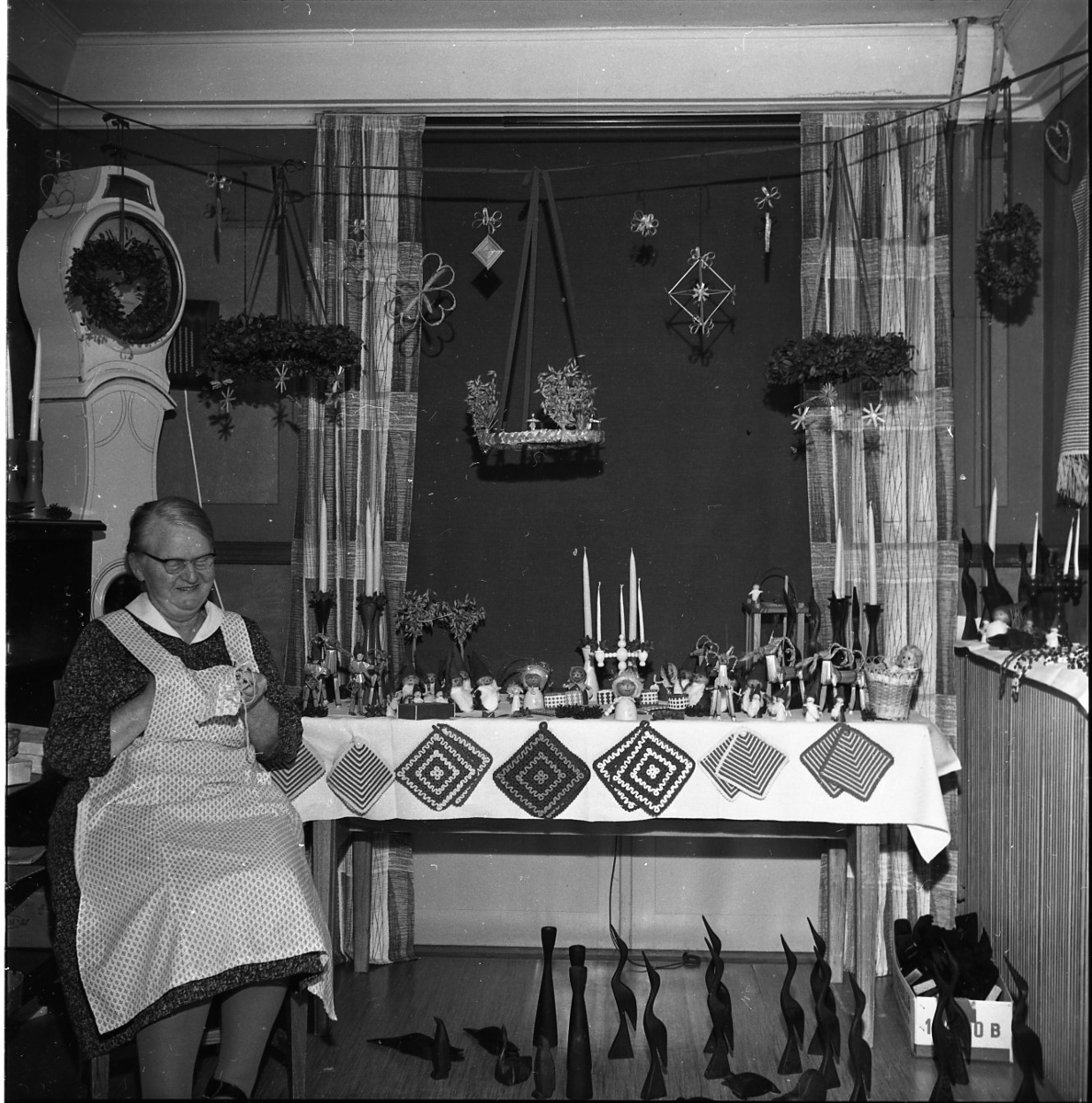 En äldre kvinna sitter och virkar. Hon sitter bredvid ett bord med juldekorationer som änglar, tomtar och ljusstakar. I taket hänger kransar.