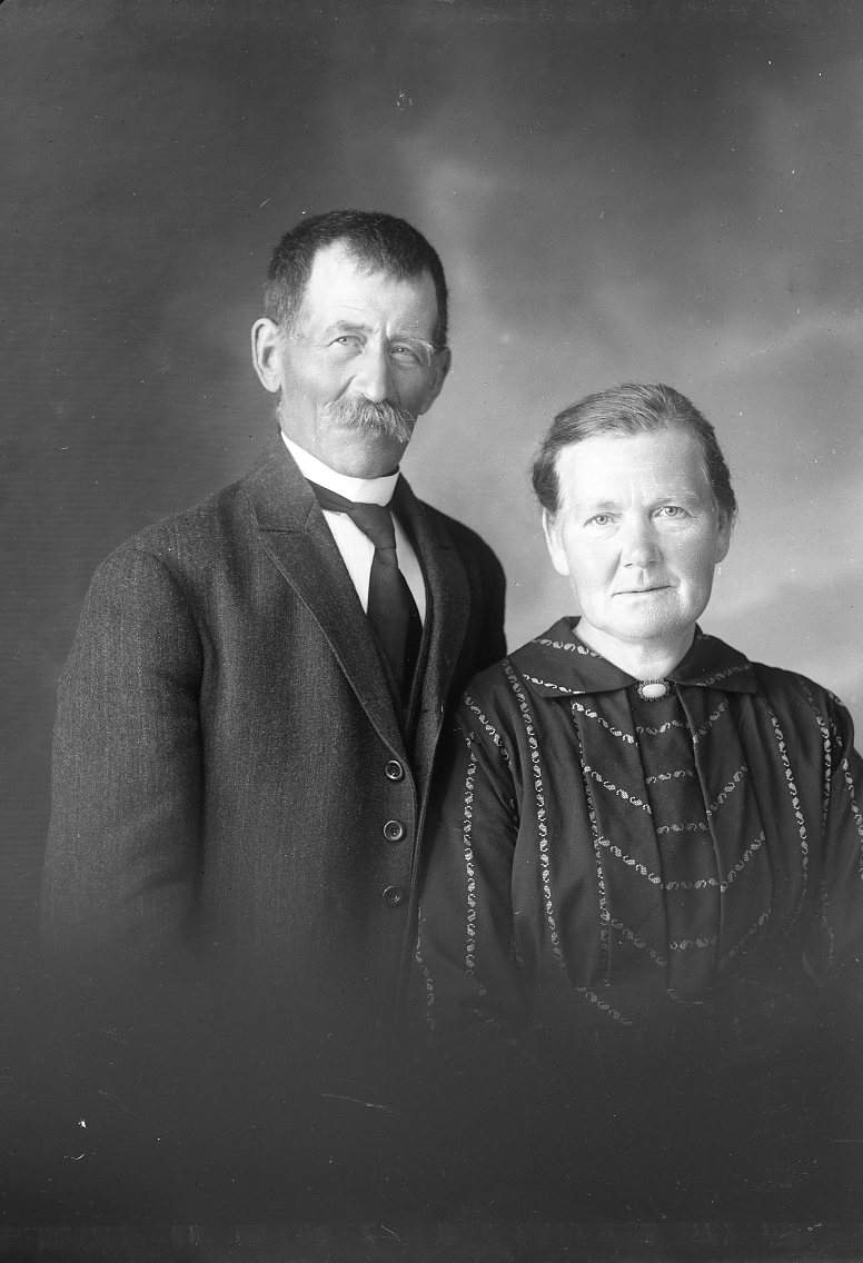 Ett äldre par, en man och en kvinna, i halvfigur. Det är Andersson från Stadsberget i Gränna.