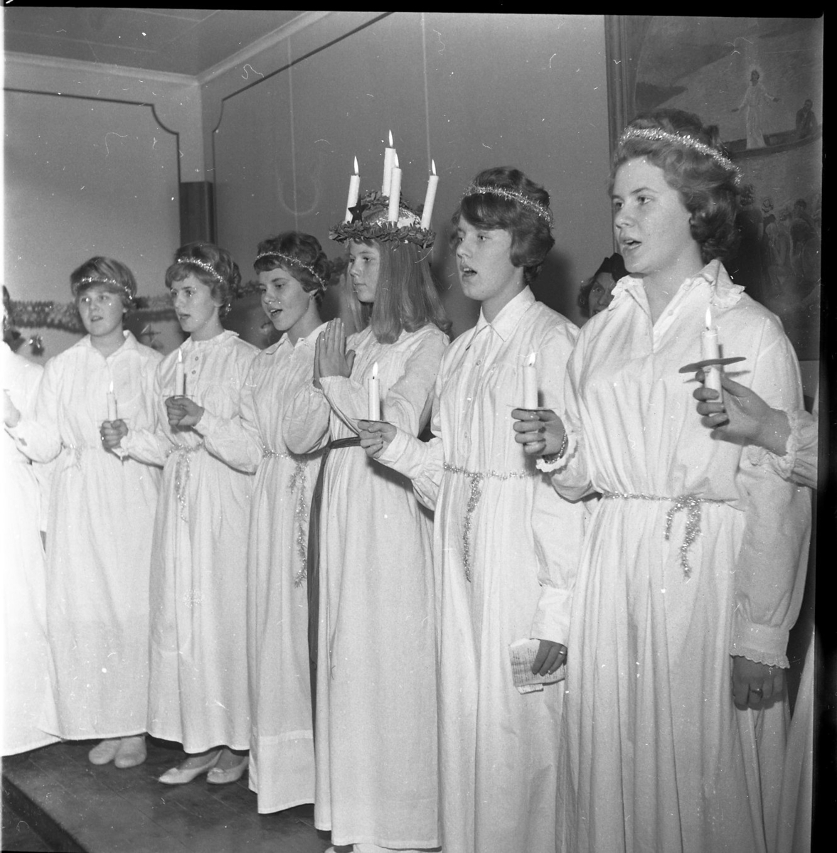 Gränna scoutgårds lucia och tärnor uppställd i okänd lokal. Lucian heter Marita Wallmo.