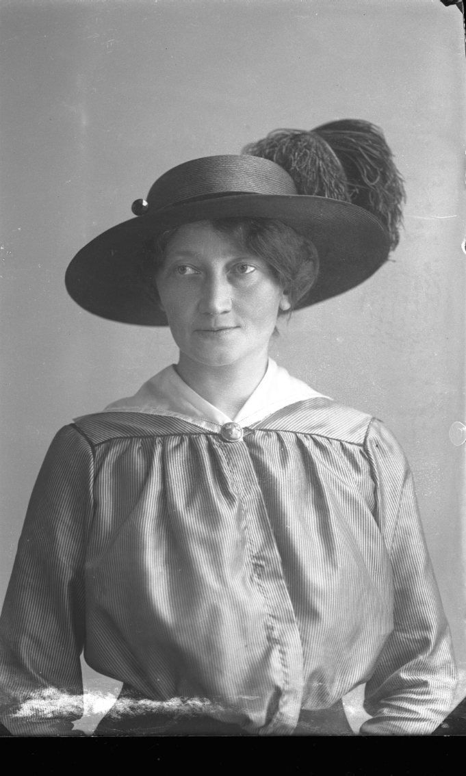Porträtt av en kvinna med bredbrättad hatt med plym.