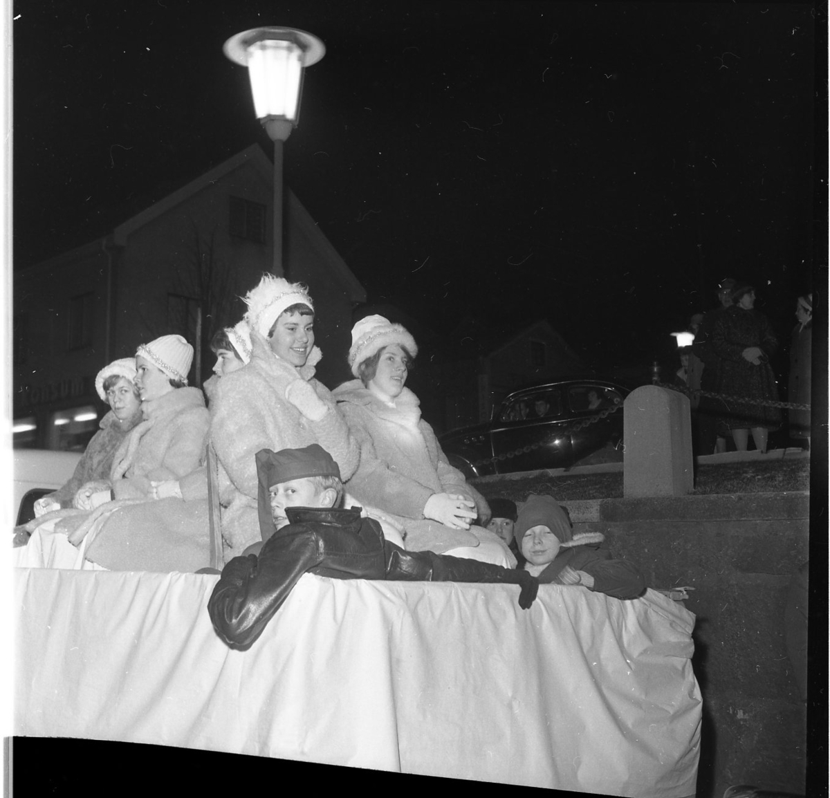 Titel: Gränna scoutkårs luciatåg och tomtenissar sitter varmt klädda på en VW-pickup.