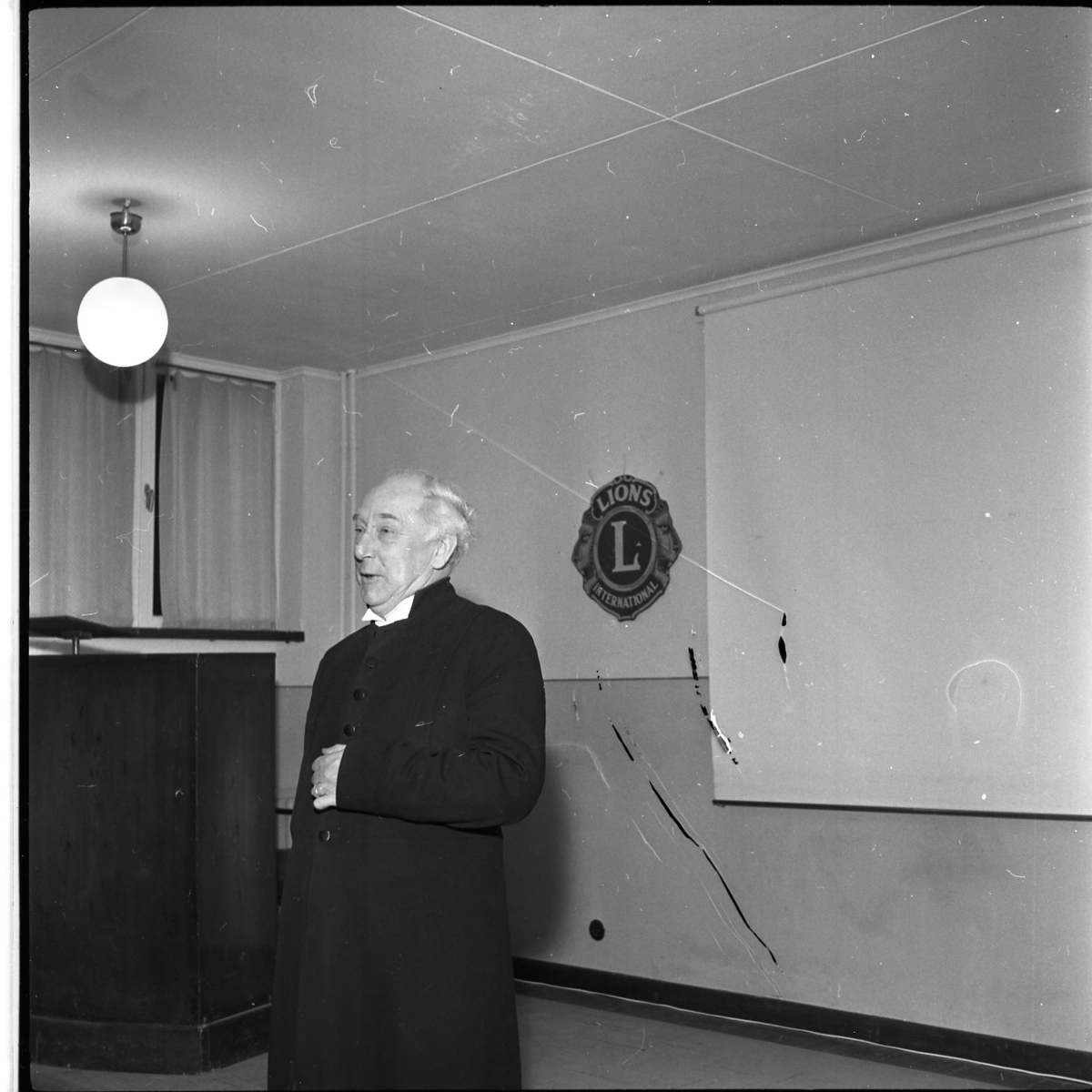 En man står och håller ett tal. En Lionsskylt hänger bakom honom.