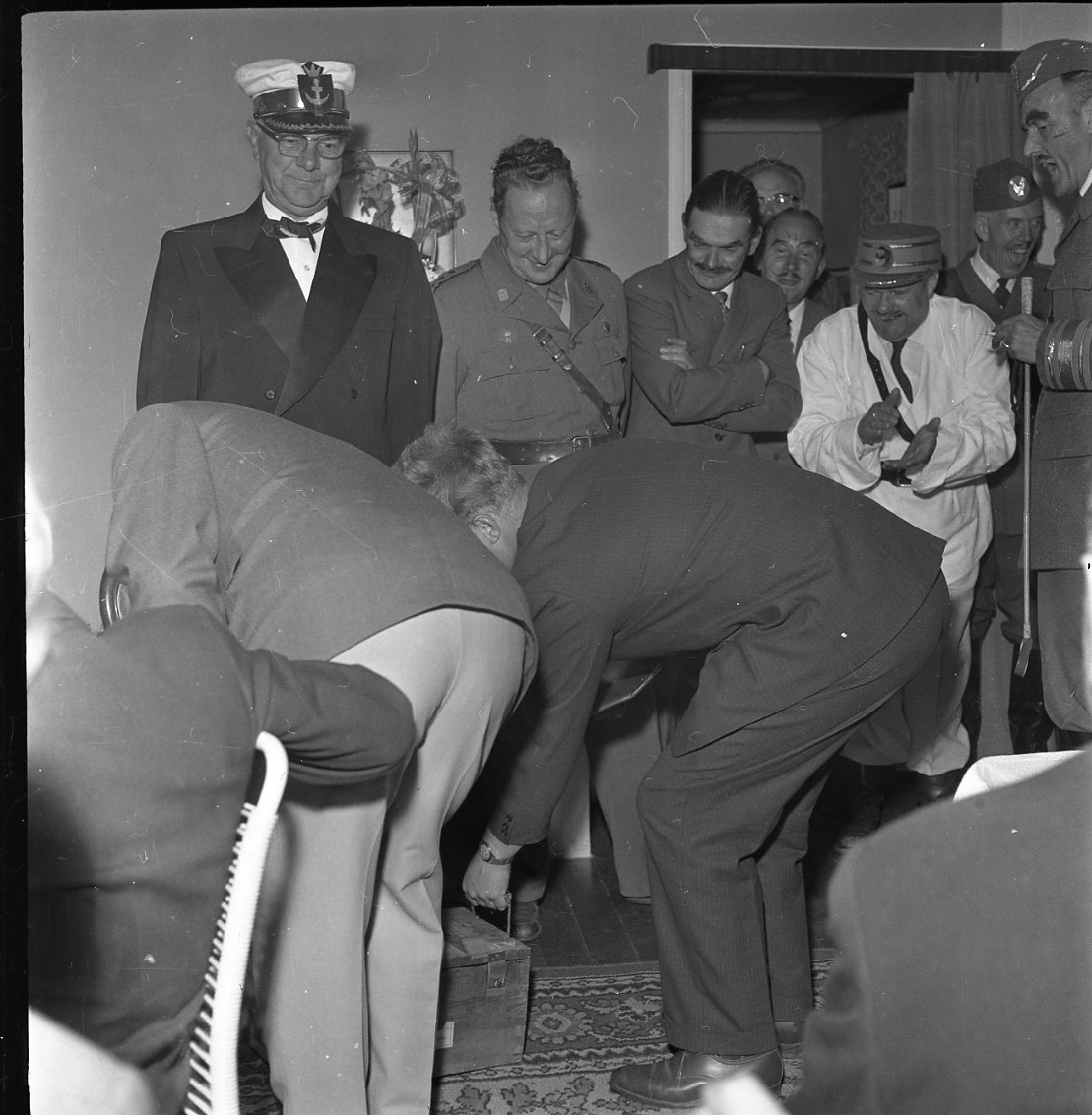Spex i samband med Osse Gustafssons 60-årsdag. Han står i centrum i mörk kavaj och vit skärmössa. Till höger om honom står män och applåderar. De har blicken mot ett par män som står böjda framför sig.