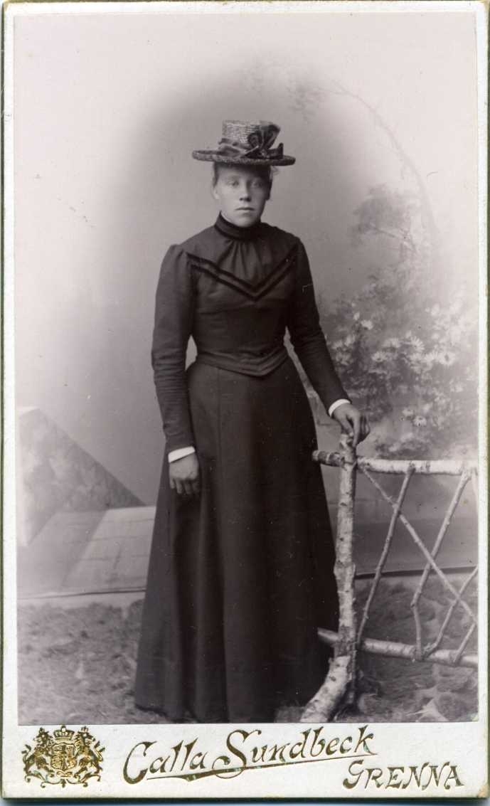 Kabinettsfotografi: en okänd ung kvinna i mörk klänning och hatt, stående vid ett staket av grenar och kvistar.