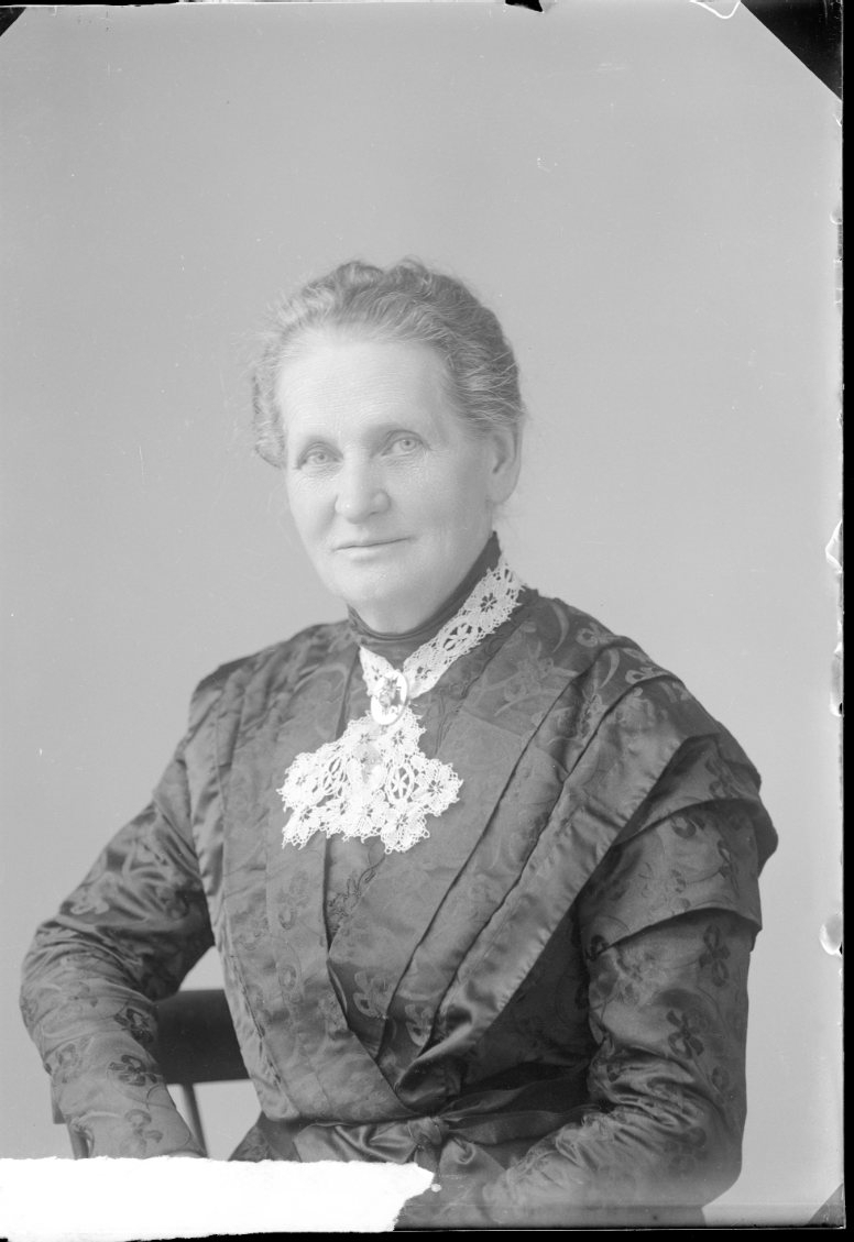 Porträtt av en äldre kvinna som sitter i en fåtölj. Hon bär en mörk klänning med ljus spetskrage.