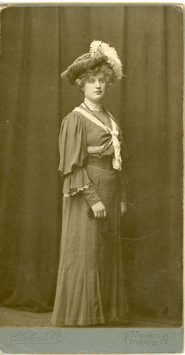 Kabinettsfotografi av en okänd ung kvinna i helfigur med plymhatt.