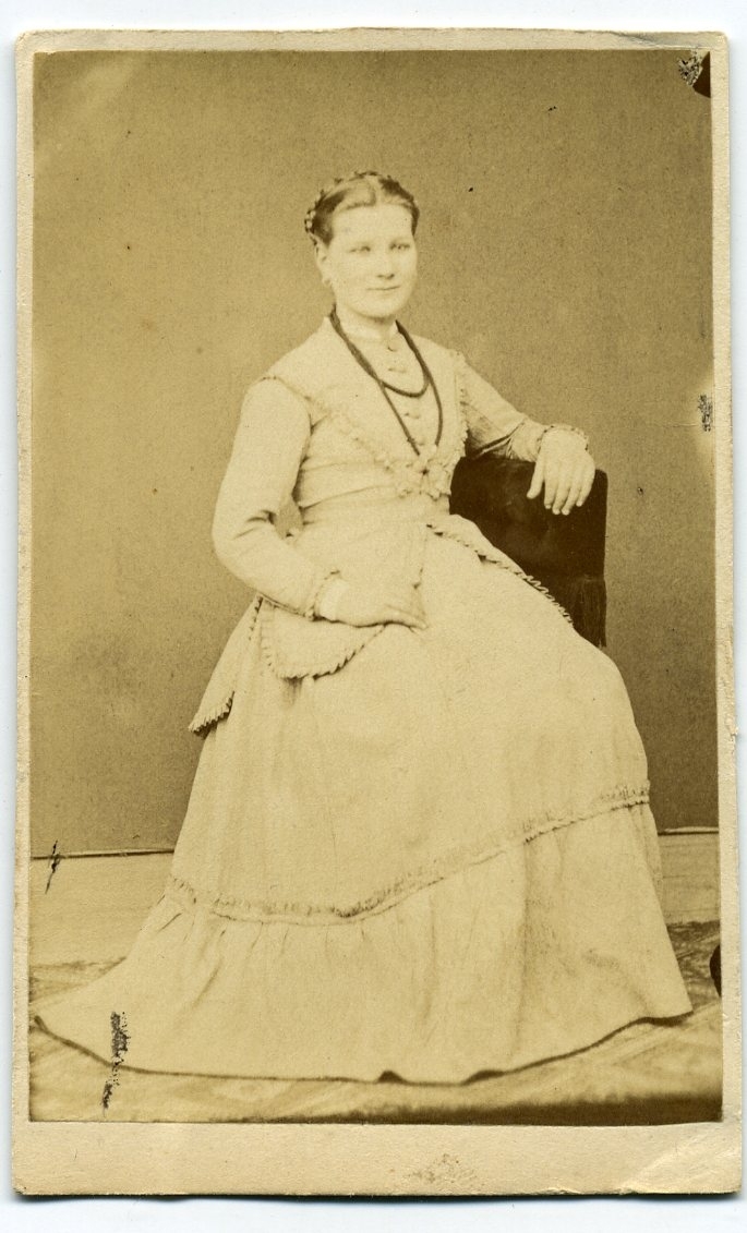 Kabinettsfotografi: porträtt av okänd ung kvinna i ljus klänning och halsband. Hon sitter på snedden på en stol.