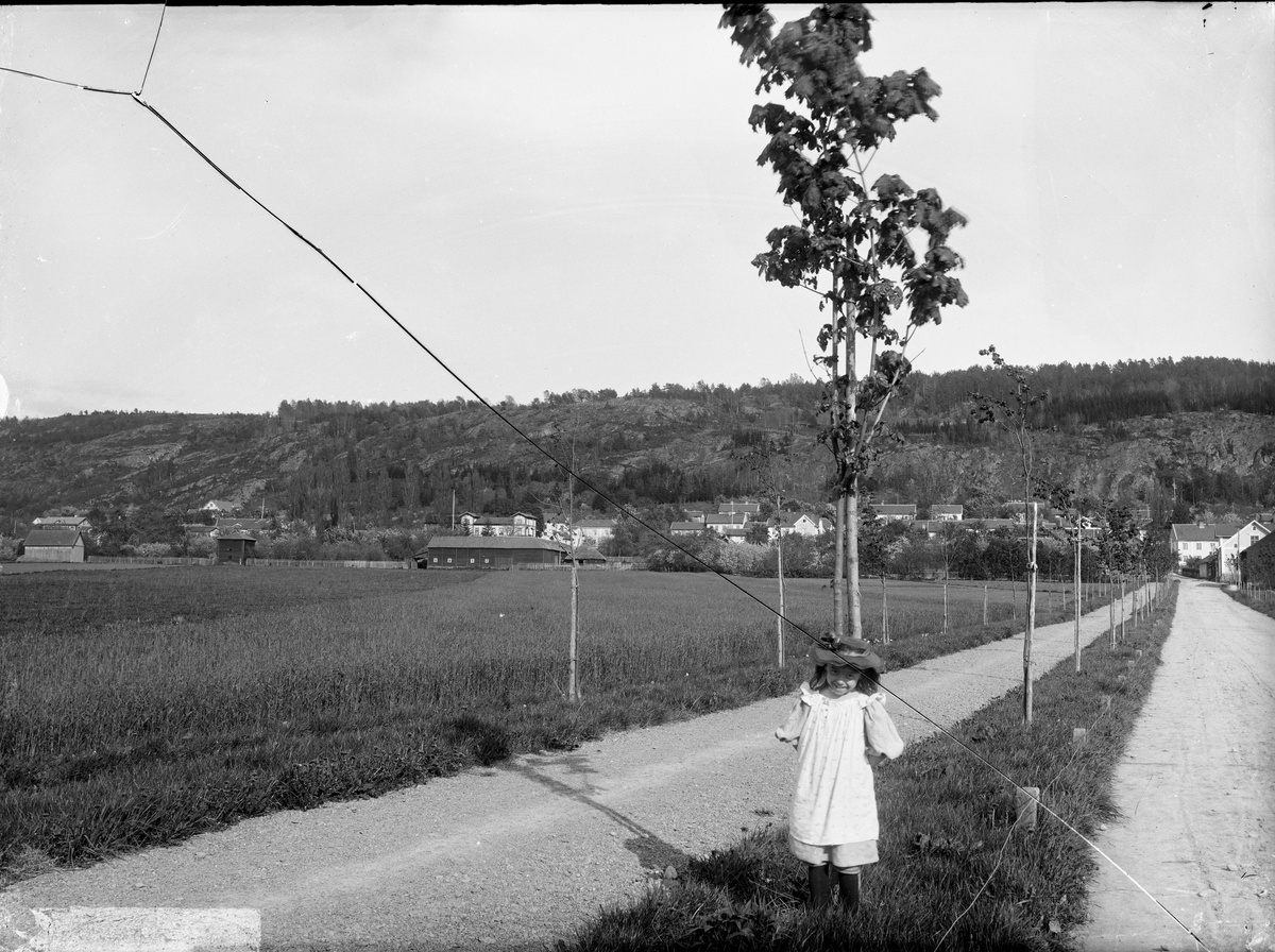 En liten flicka i ljust med hatt på huvudet står leende vänd mot fotografen. Hon står på Hamnvägen, på en grässträng mellan gångbanan och vägen i riktning mot hamnen. Nyplanterade träd utmed vägen.
