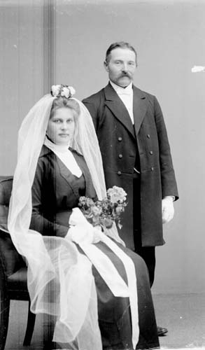 Ett brudpar. Bruden sitter på en stol och brudgummen står på hennes vänstra sida.