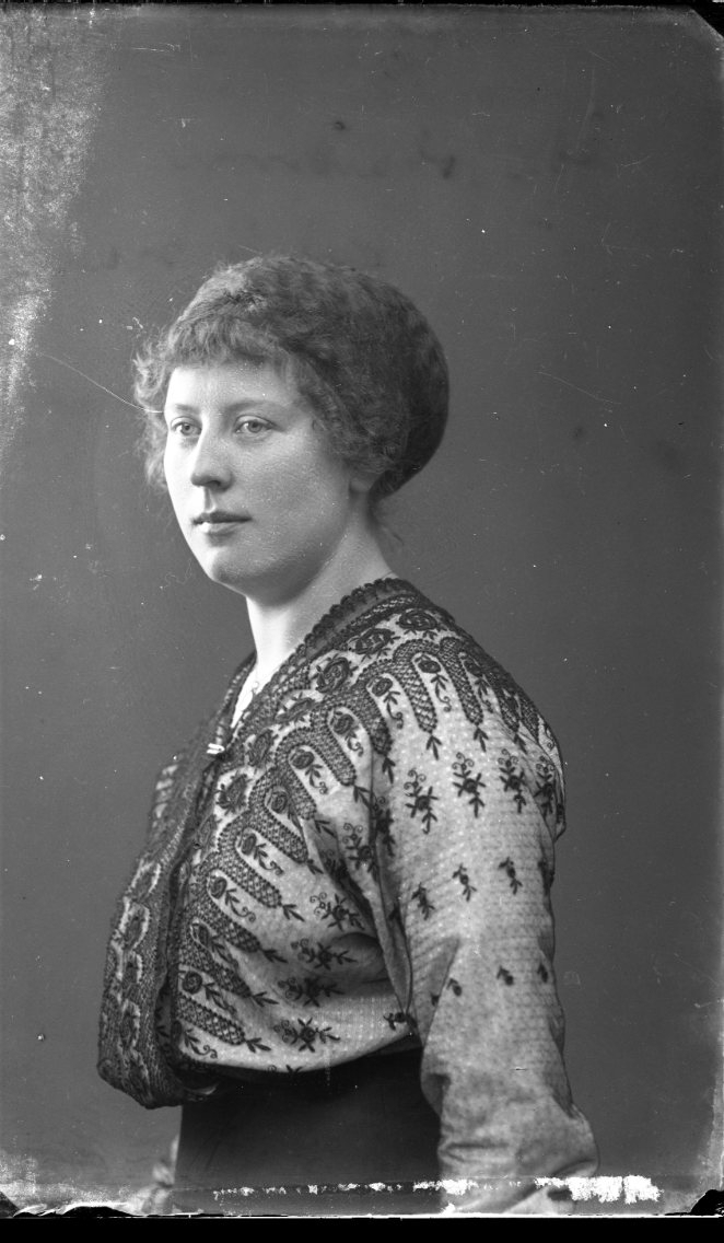 Porträtt av en ung kvinna i livstycke med broderi. 3/4-profil