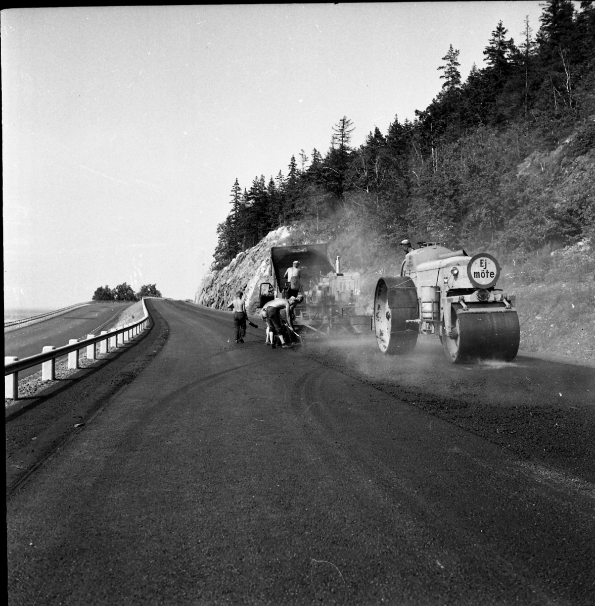 En ångvält kör över nyligen utlagd asfalt. Flera arbetare med bar överkropp går bakom och rakar ut asfalt.