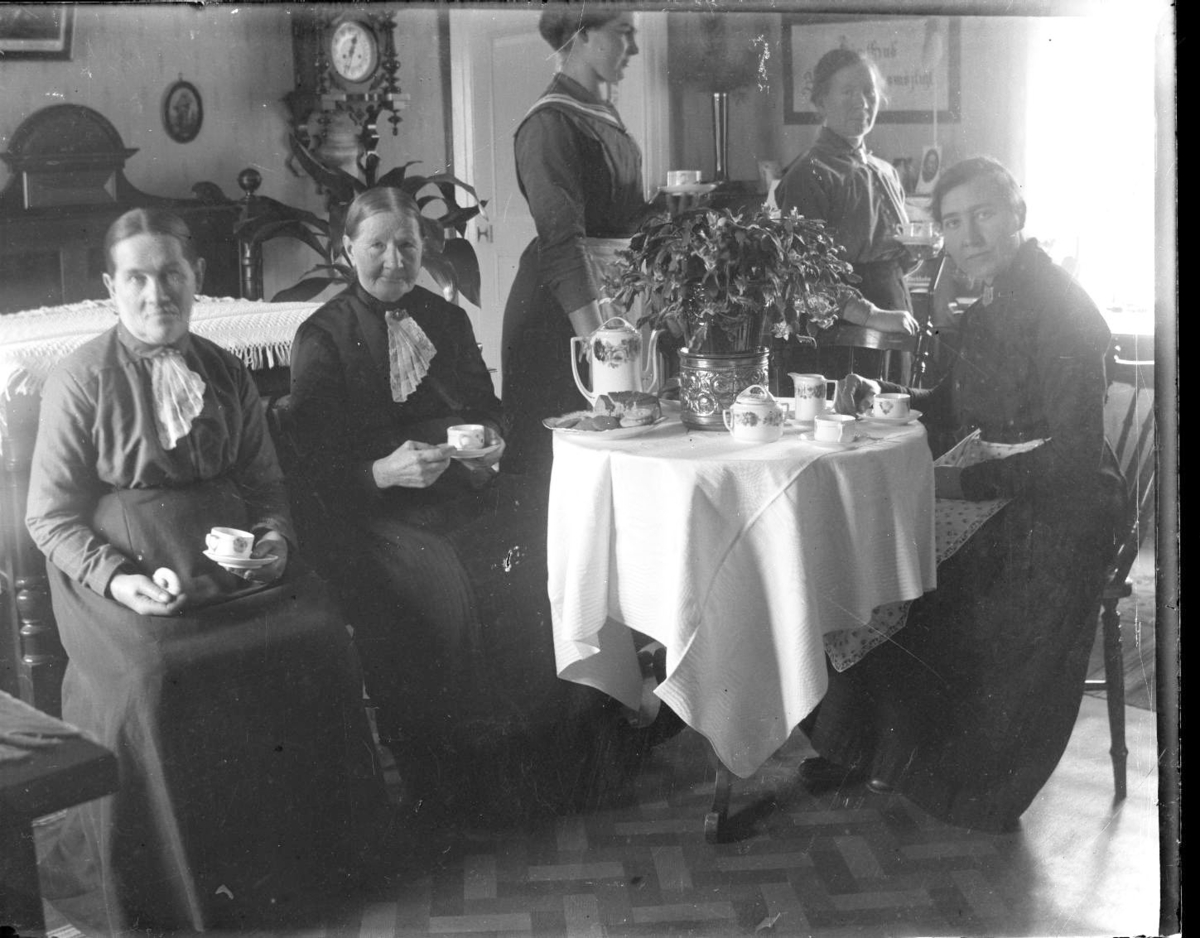 Tre kvinnor sitter med kaffekopp i händerna sitter vid ett kaffebord. Blommor, koppar och kaffebröd på bordet. Två kvinnor varav en hushållerska (?) står på andra sidan bordet.