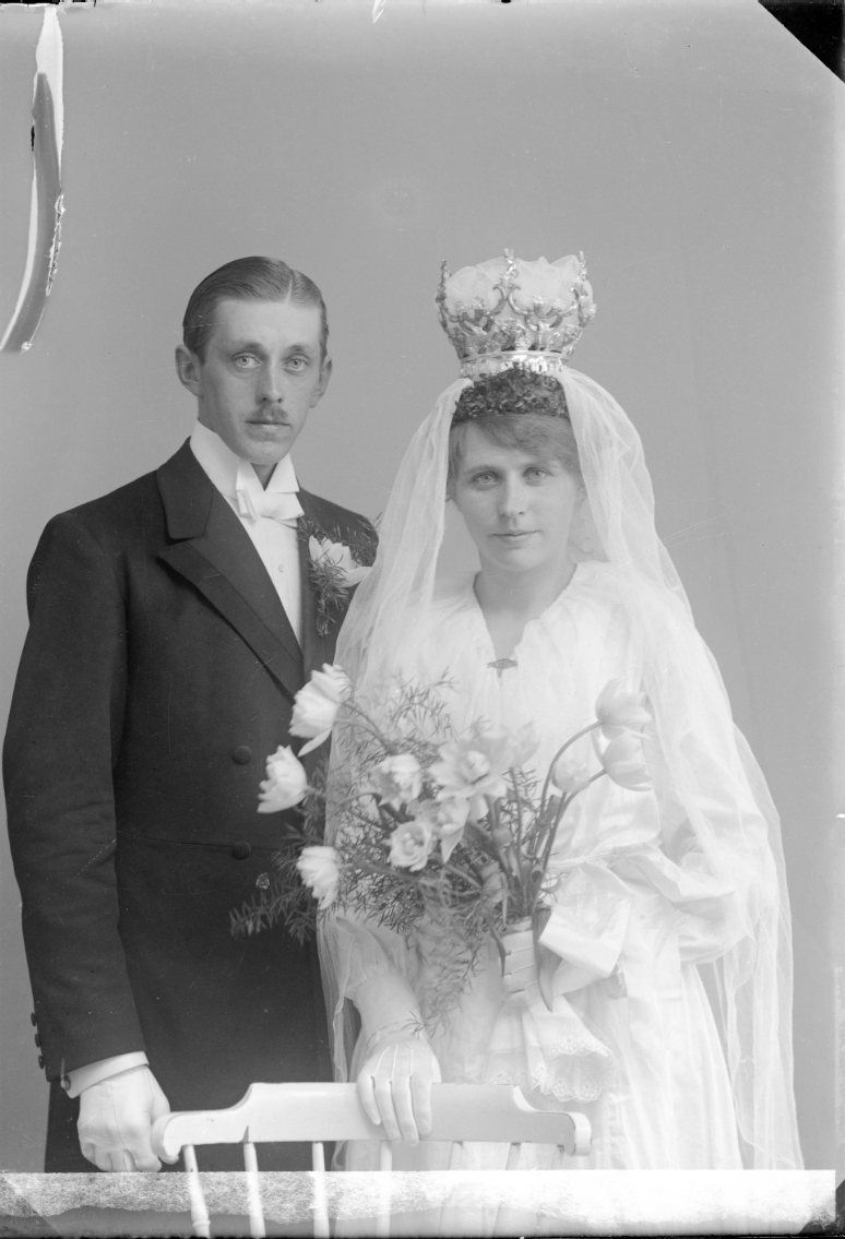 Ett brudpar står vid en pinnstol, bruden i vitt.