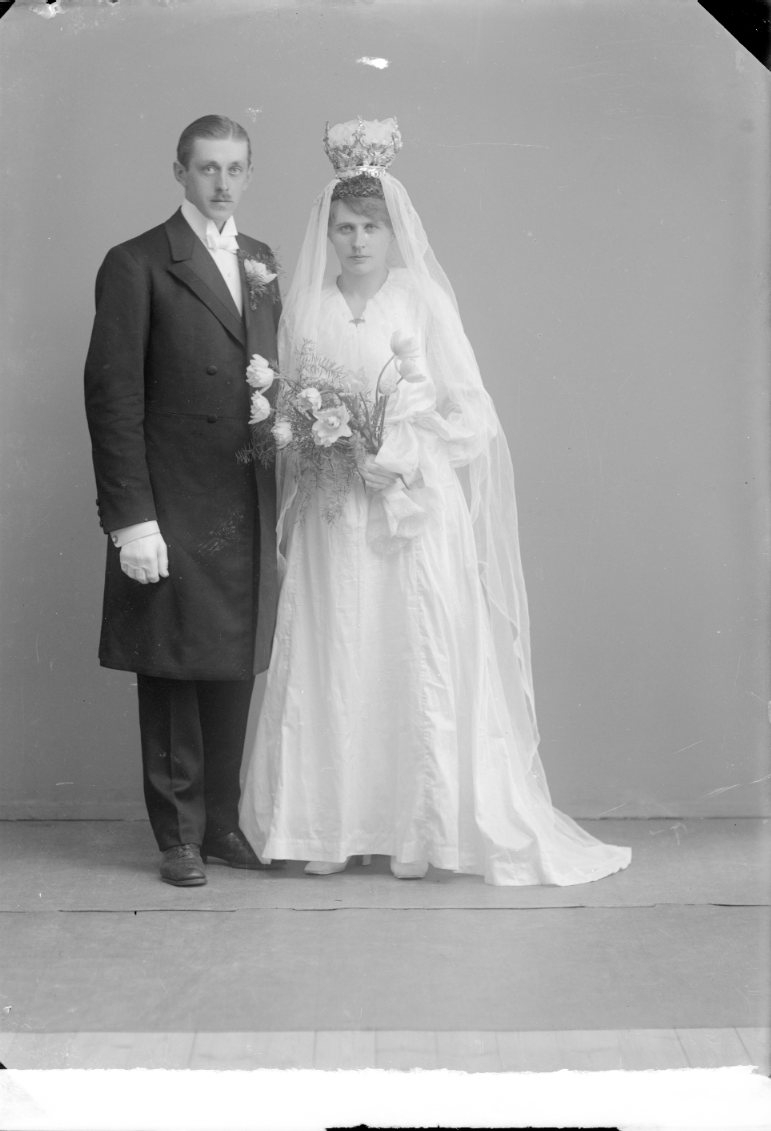Ett brudpar står vid en pinnstol, bruden i vitt.