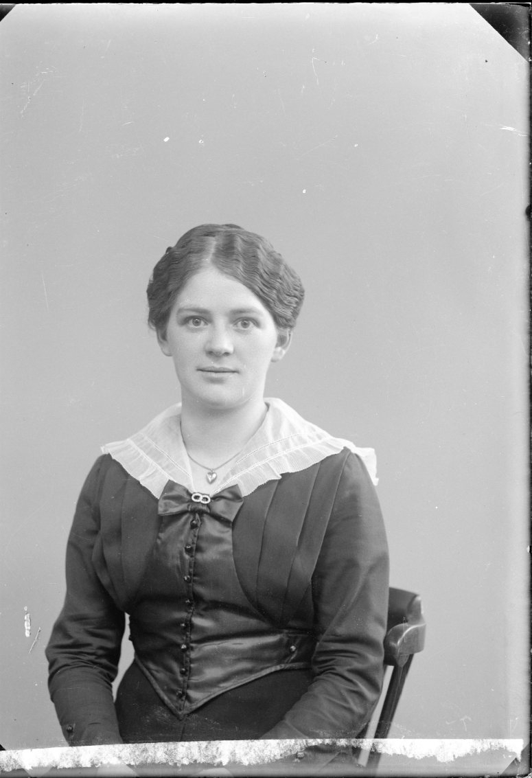 Porträtt av en ung kvinna med mörkt plisserat livstycke med blankt tyg i mittparti. Hon sitter på en stol. Halssmycke i form av ett hjärta.