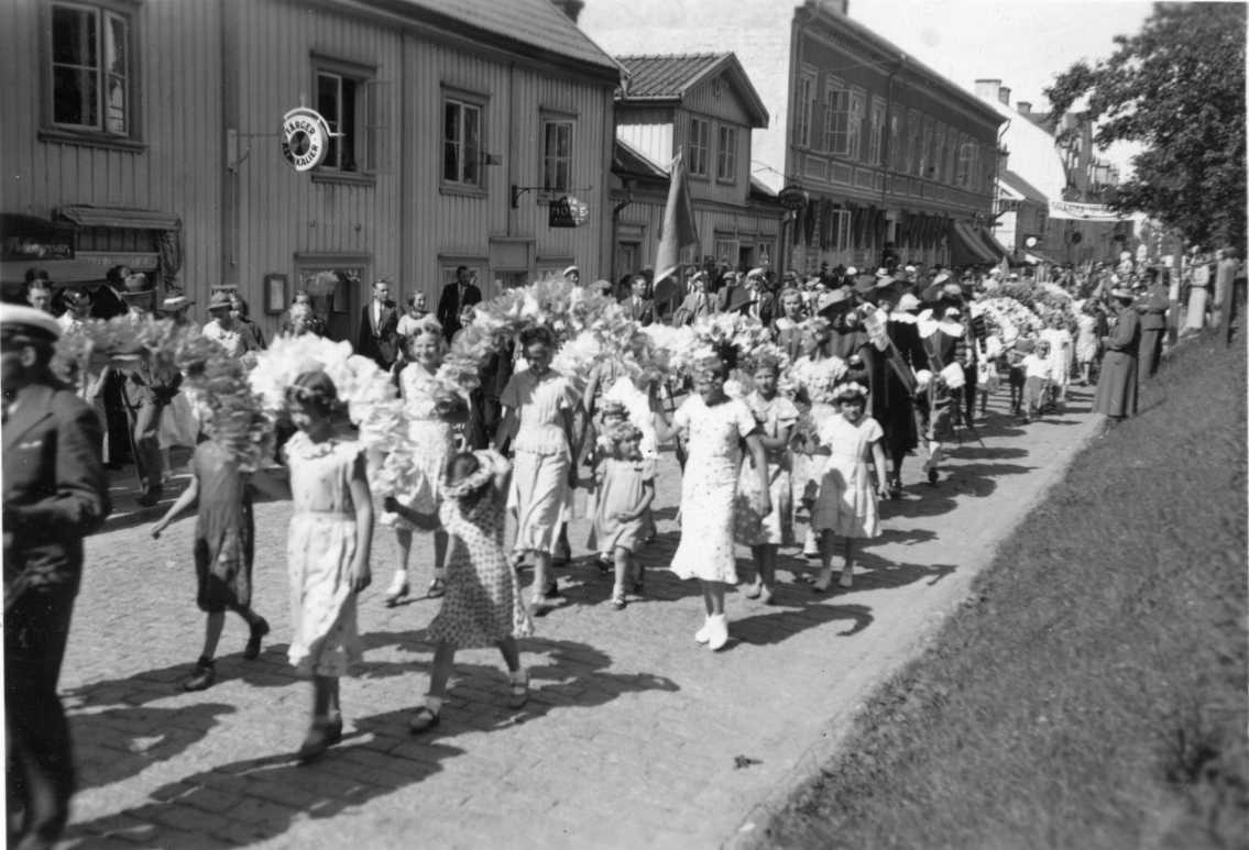 Kortege på Brahegatan i Gränna. Barn med blomsterbågar. Fasadskyltar för "Färger Kemikalier" respektive "Nya Modeaffären"