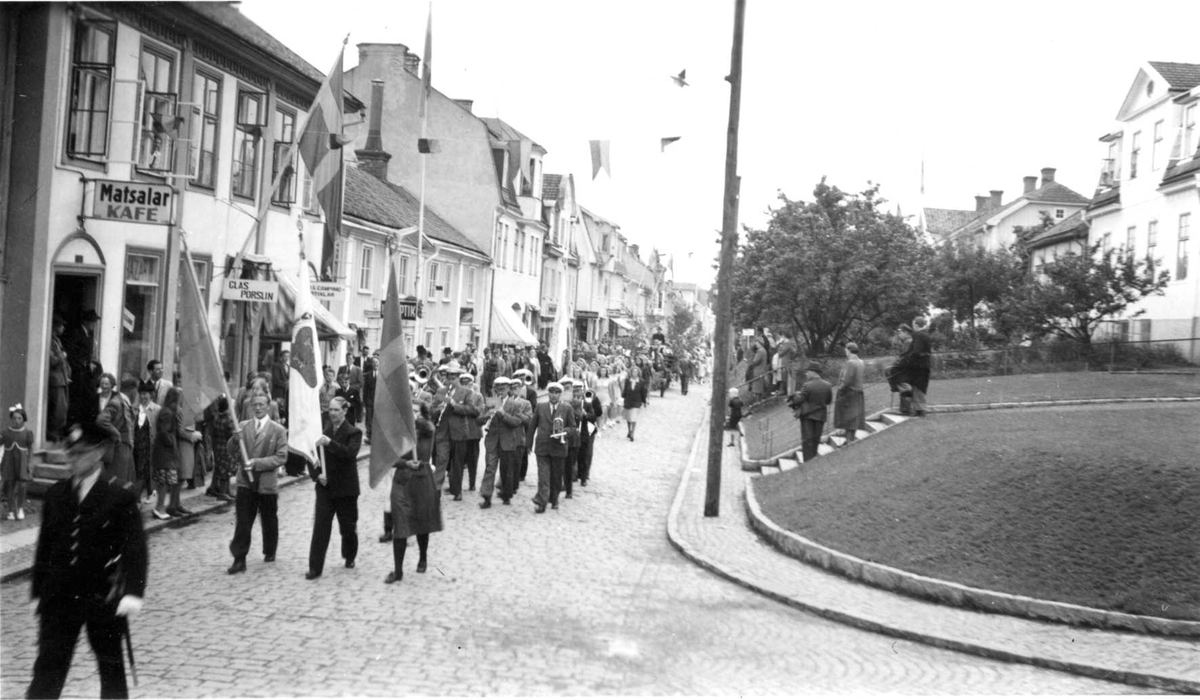 Kortege med fanbärare och musikkår framför unga och gamla på Brahegatan i Gränna.