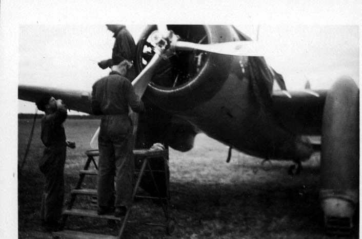 Tre mekaniker i overall i arbete vid ett enmotorigt propellerplan.