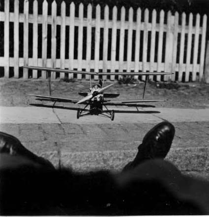 Modellflygplan på en trottoar. Fotografen sitter tillbakalutad på gatan när han fotograferar.