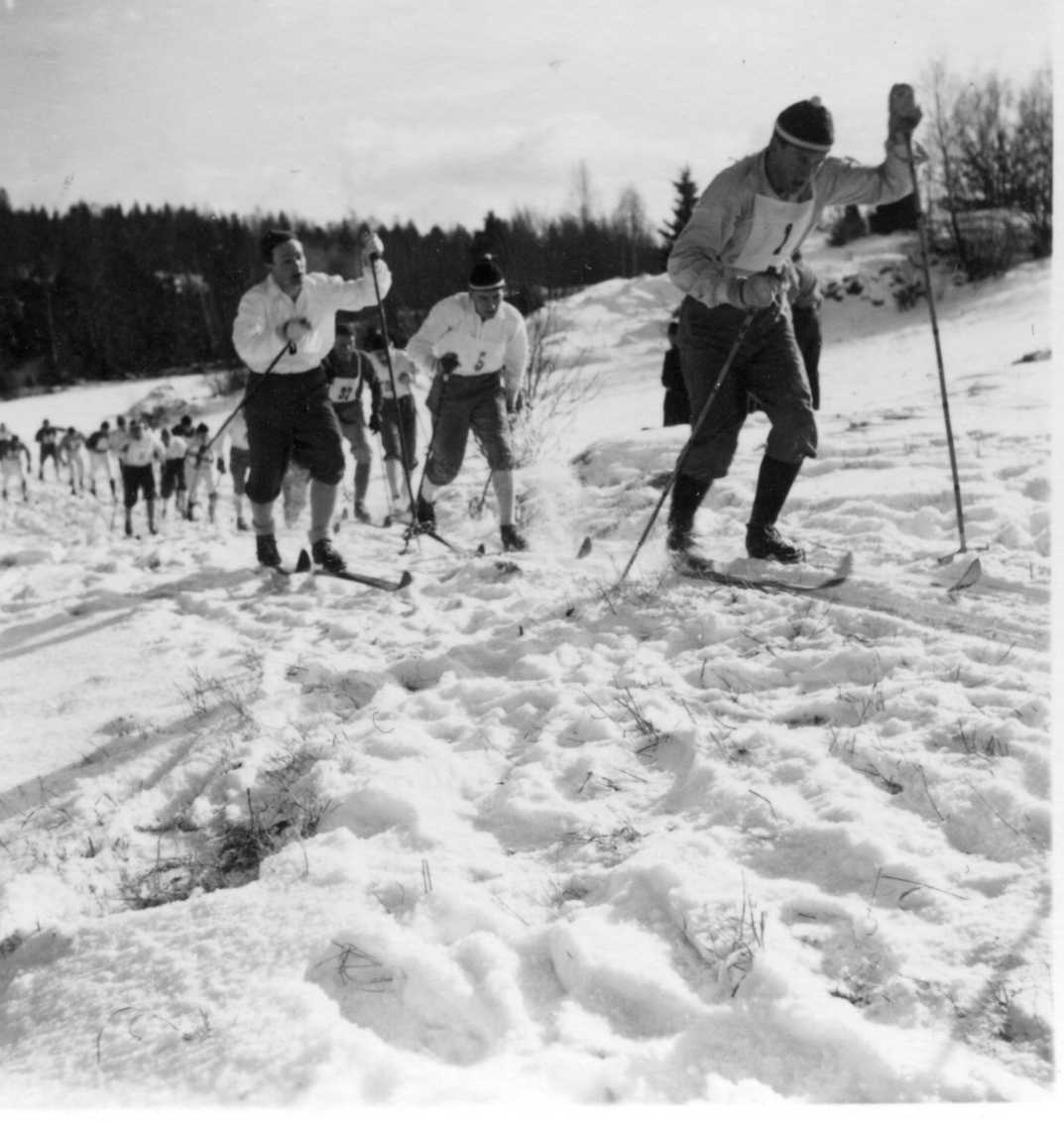 Skidåkare kämpar sig uppför en backe, troligen i samband med Braheloppet.