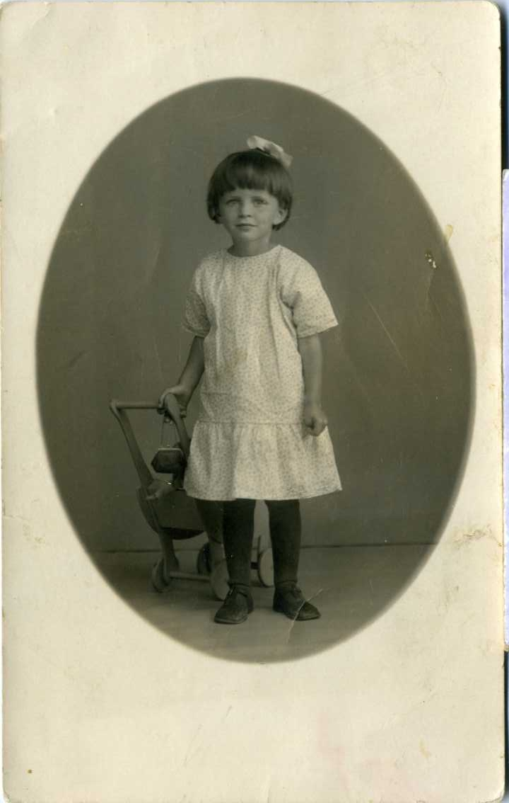 Porträtt av en liten flicka med en dockvagn och en lite väska i handen.