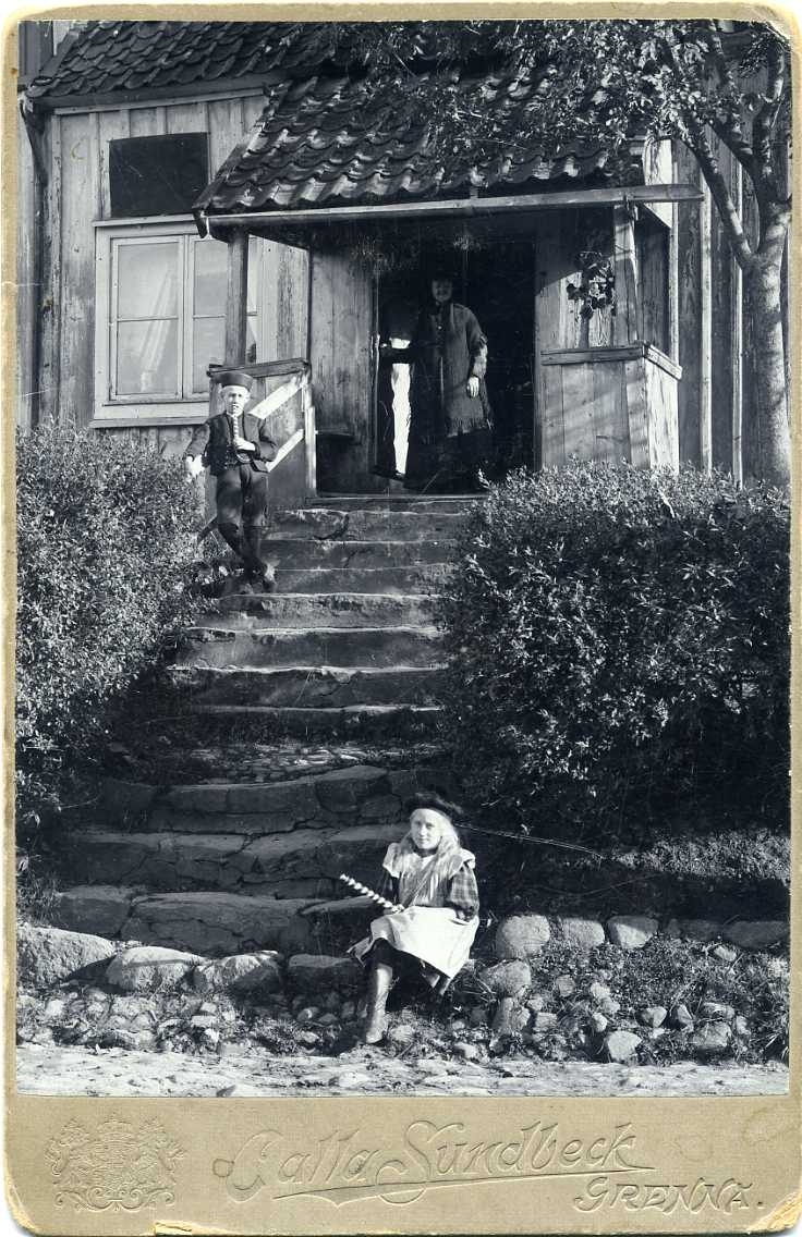 En kvinna står vid farstun till sitt sockerbageri. En pojke står några steg ner i en trappa som leder till gatan. Han slickar på en polkagris. På nedersta steget vid gatan sitter en flicka med en polkagris i handen, de båda är syskon.