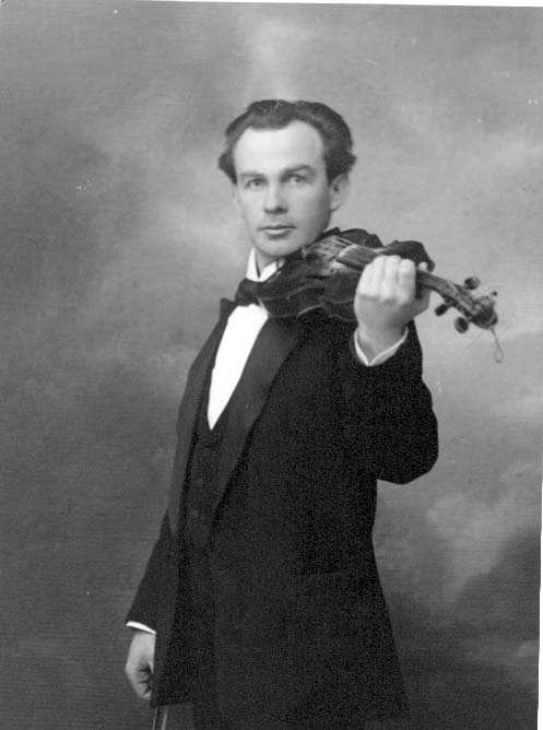 Porträtt av Edvard Berggren i högtidsklädsel. Han står lite på sidan, blicken mot fotografen och en fiol under hakan. Stråken i höger hand utmed kroppen.