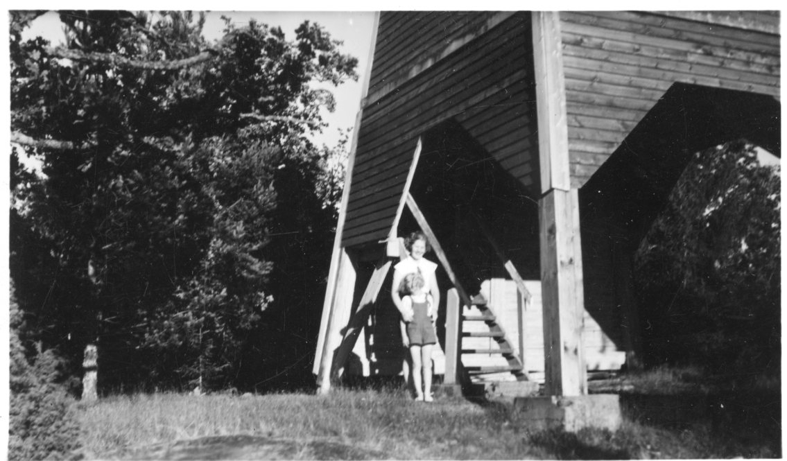 En kvinna och en flicka står i motljus vid en klockstapel.