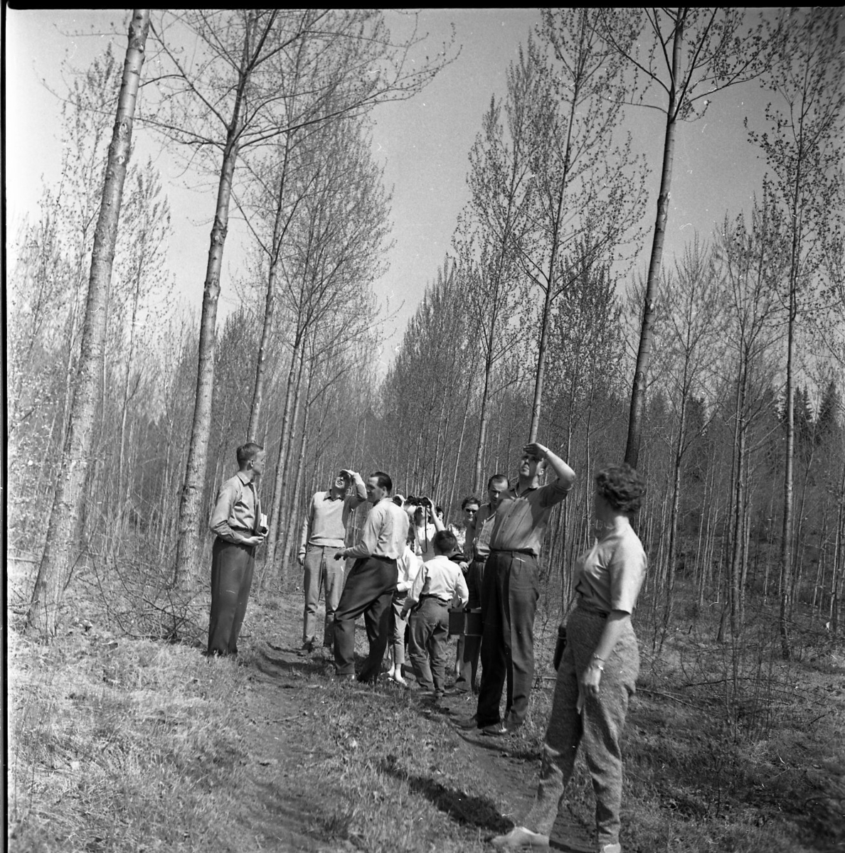 En grupp människor står och tittar upp mot trädkronorna. En person har en kikare. Det är kvinnor, män och barn i gruppen. Framför dem står en person i skjorta och slips. Fågeskådare?