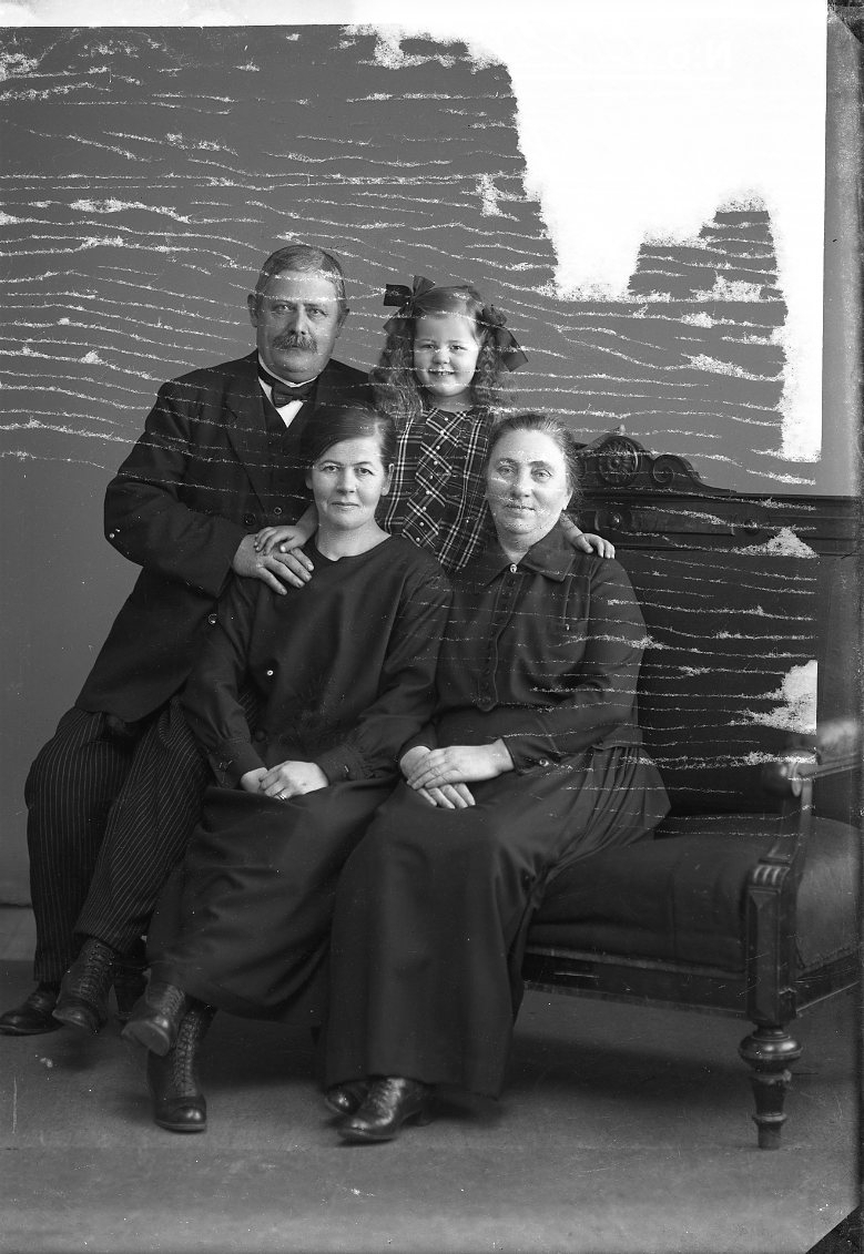 Ett äldre par, en yngre kvinna och en flicka i en soffa - möjligen tre generationer.