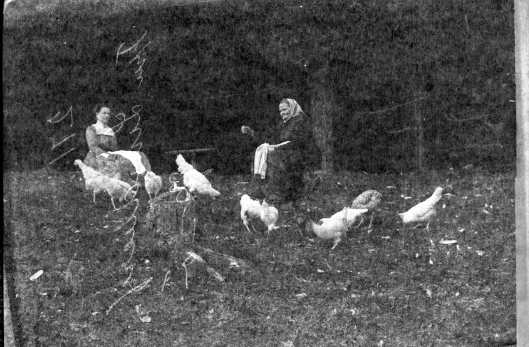 Två kvinnor sitter på en gräsplan omgiven av höns. Den äldre kvinnan, till höger, matar dem möjligen. Hennes namn är fru Lundberg, Visingsö.
