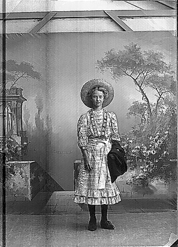 Karin Johansson i klänning med veck och midjeband och hatt på huvudet i ateljé med antik scenografi.