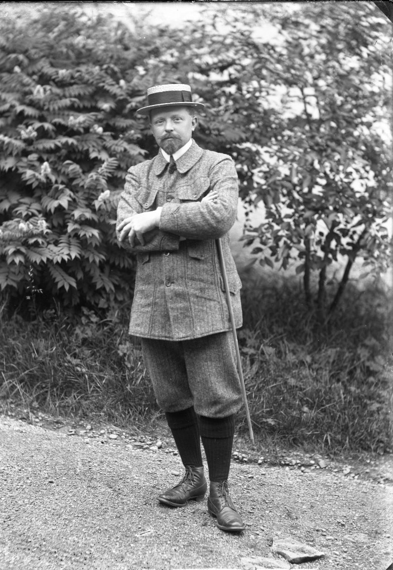 Porträtt i av kostymklädd man med stråhatt, knäkorta byxor med sockor samt spatserkäpp över armen. Han står avslappnat med armarna i kors.