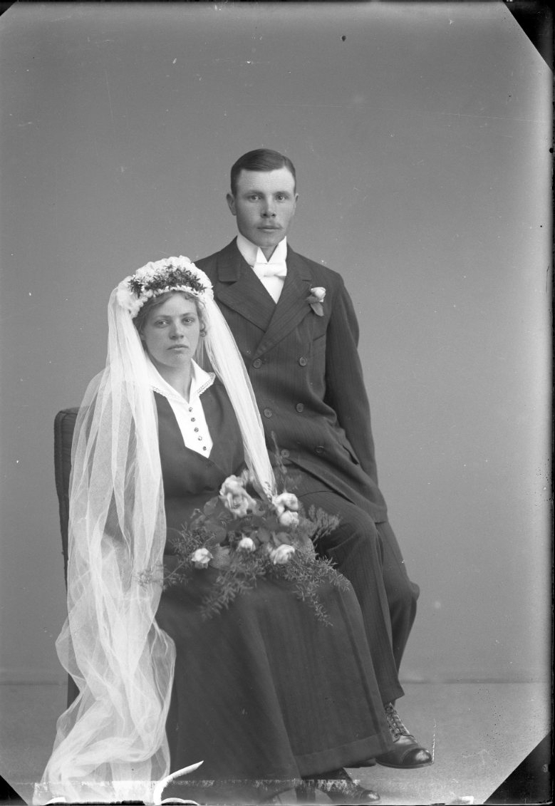 Ett brudpar. Kvinnan i mörk klänning. Hon sitter på en stol och mannen sitter på armstödet.