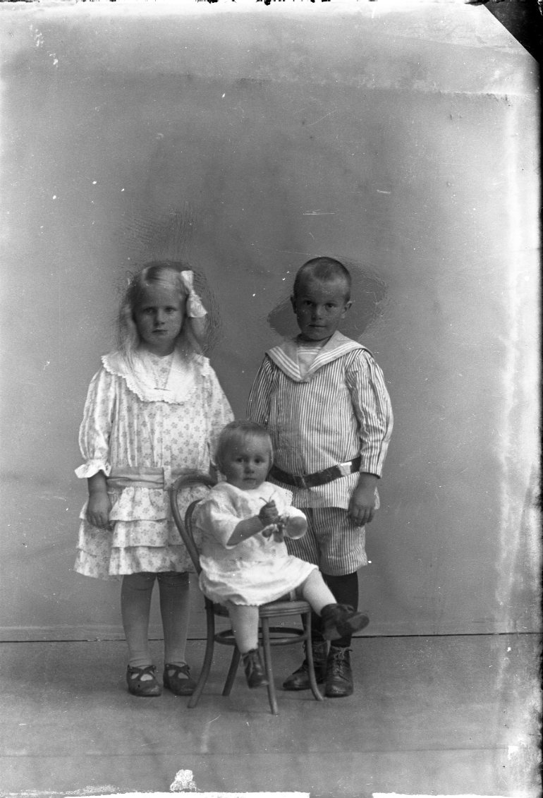 Gruppbild med tre barn - barnen Rydeman på Visingsö. Den yngsta sitter på en liten stol mellan sina äldre syskon.