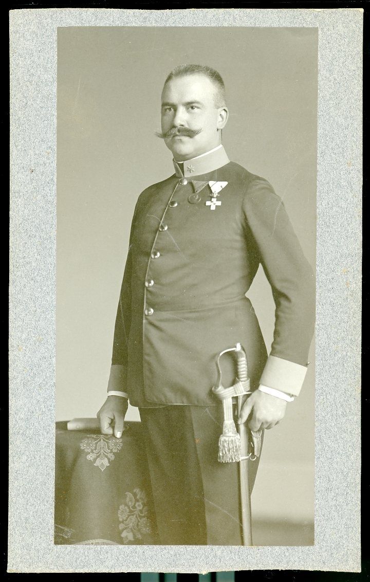 Fotografi av österrikisk-ungersk officer i uniform med medaljer på bröstet. Hans namn är möjligen Ludwig Schmitterling