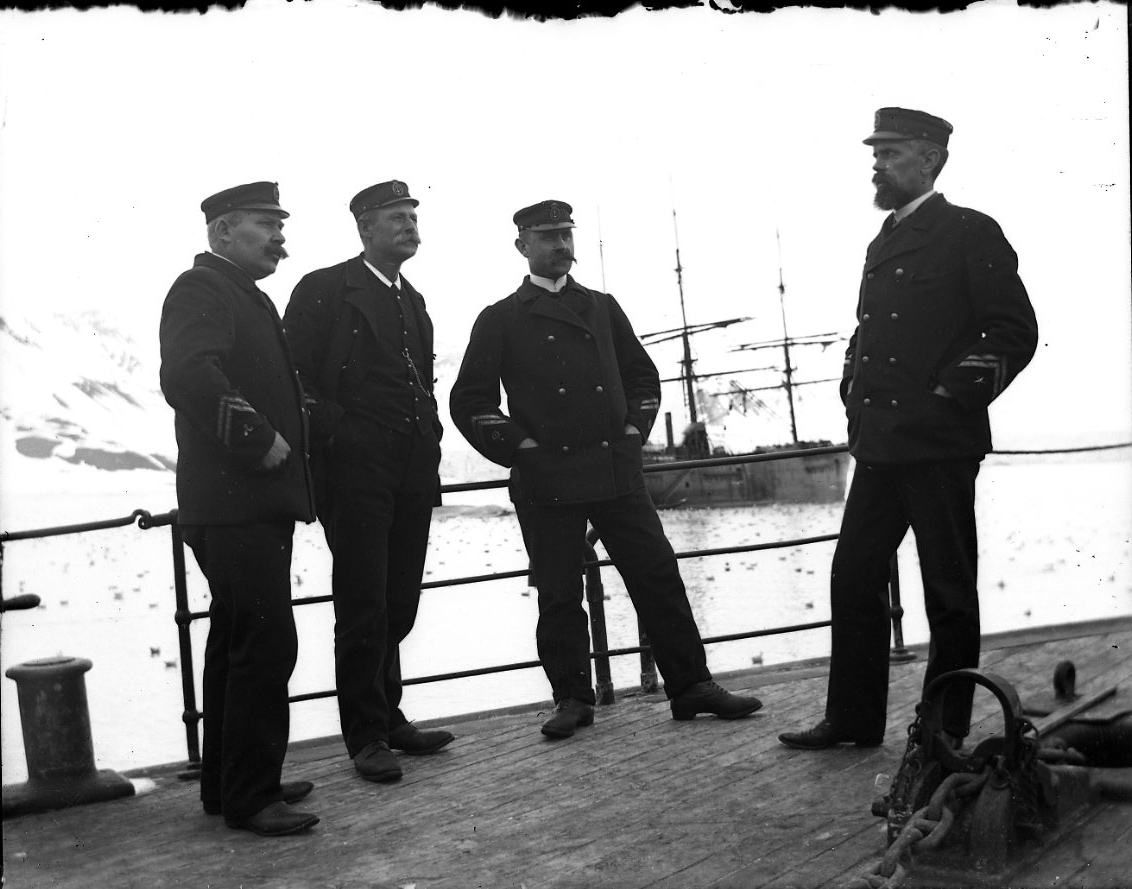 Fyra officerare ombord på kanonbåten HMS Svensksund uppe vid Spetsbergen. Bakom dem skymtar ett oidentifierat tramastat ångfartyg. Mannen till höger är kapten Hamilton. De andra från vänster, möjligen läkaren Torgersruud och löjtnanterna Lagercrantz och Arnelius.