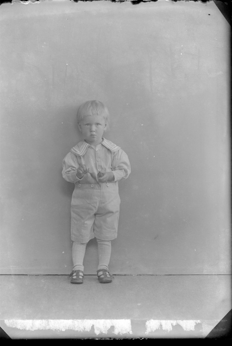 Porträtt av en liten pojke i sjömanskostym. Han håller troligen en leksak i händerna.