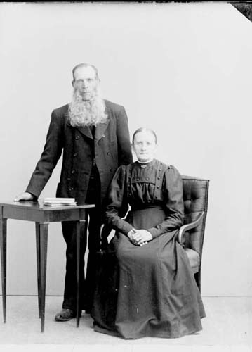 Äkta paret Johannes och Anna Britta, som sitter på en stol bredvid mannen. Mannen, med stort skägg, står med ena handen vilande på ett bord. Hon vilar händerna i knät.