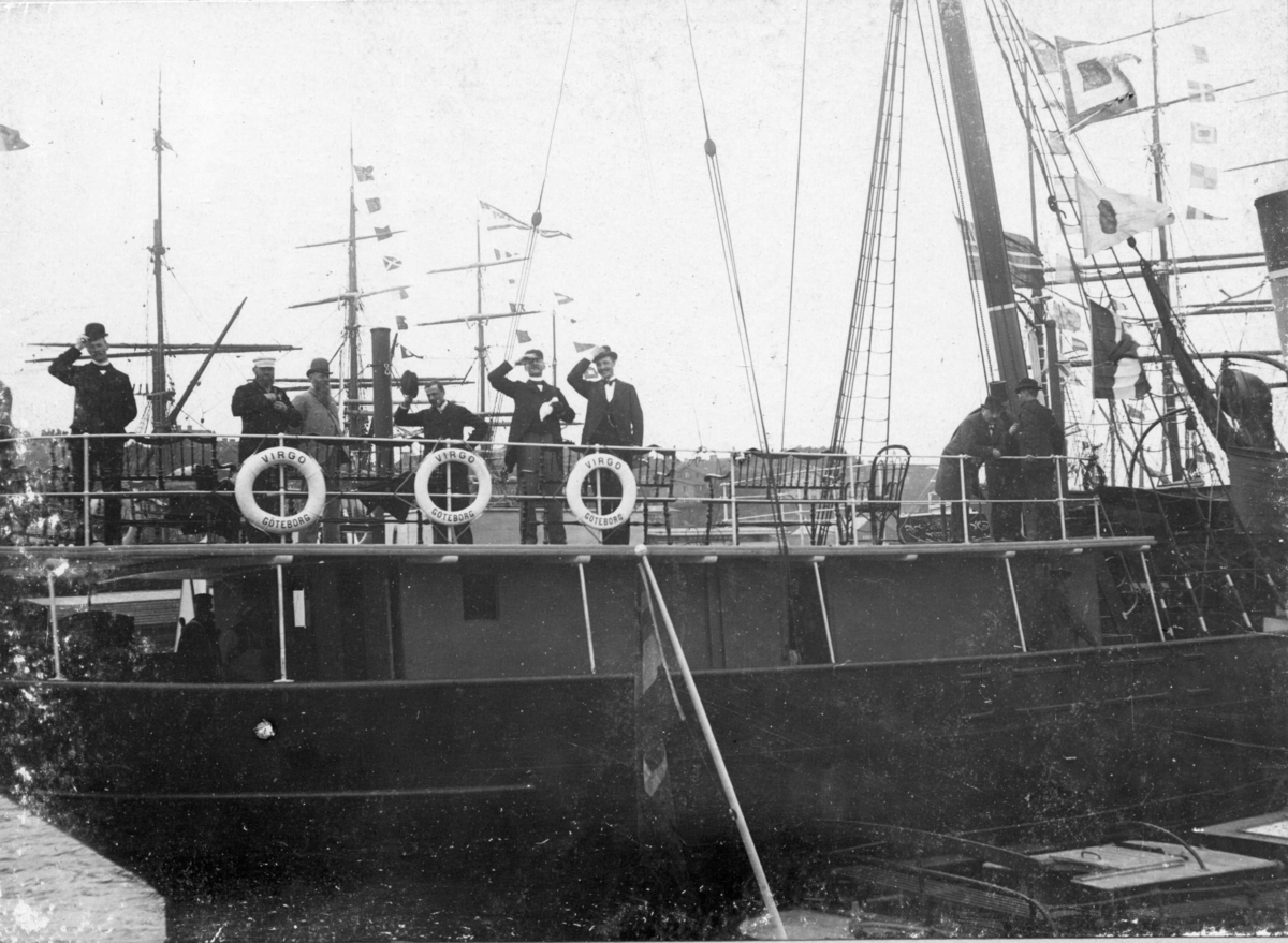 "Farväl", avresa med Virgo från Göteborg 7 juni 1896. På akterdäck syns med hand på hatten: Carl Ekelund, Henri Lachambre, S A Andrée samt Nils Strindberg