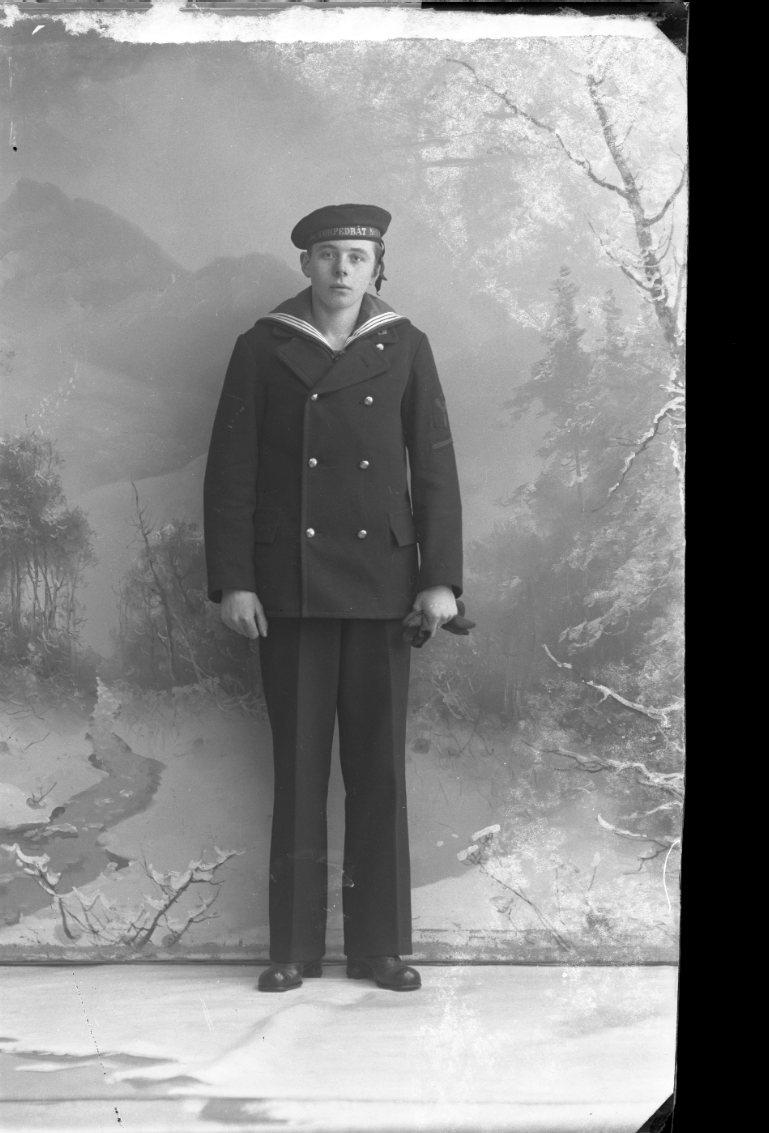 Porträtt av en ung matros med kepts märkt ..."torpedbåt"...