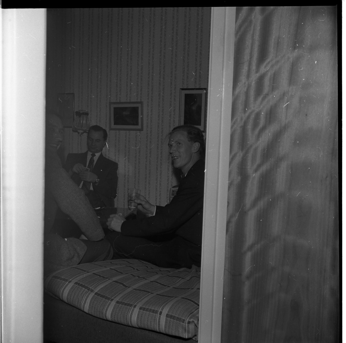 Längre in i ett rum sitter män och spelar kort. En man till höger har ett glas i handen.
