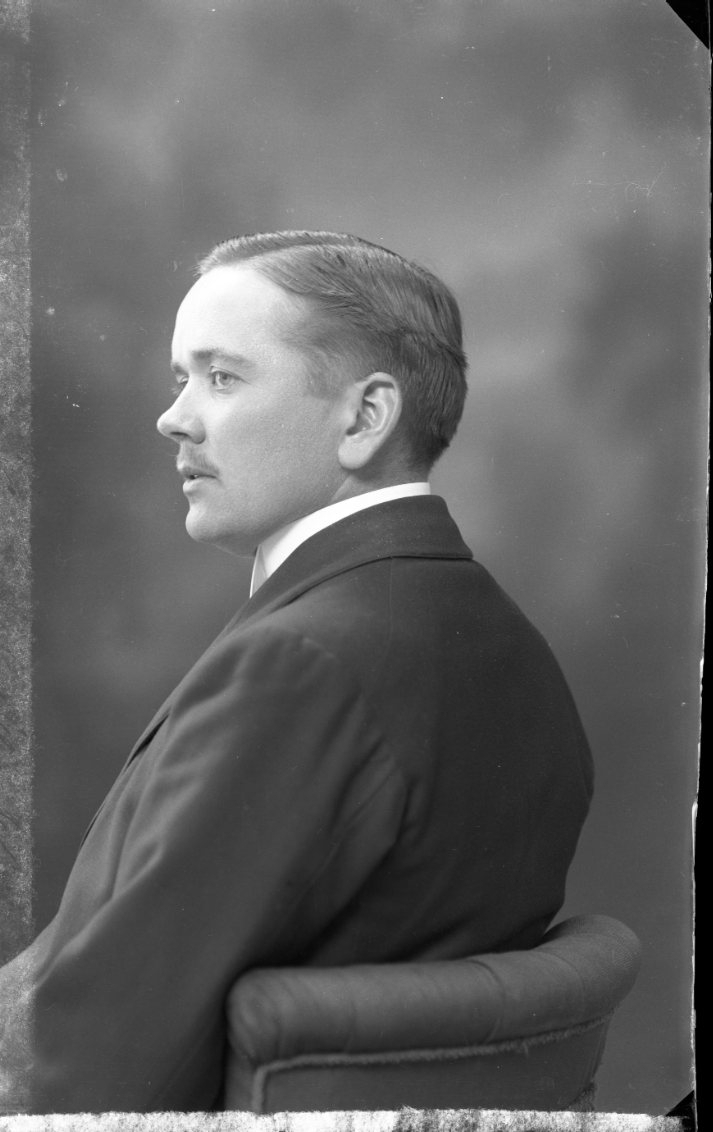 En ung man med tunn mustasch sitter på en stol. Fotograferad snett bakifrån.