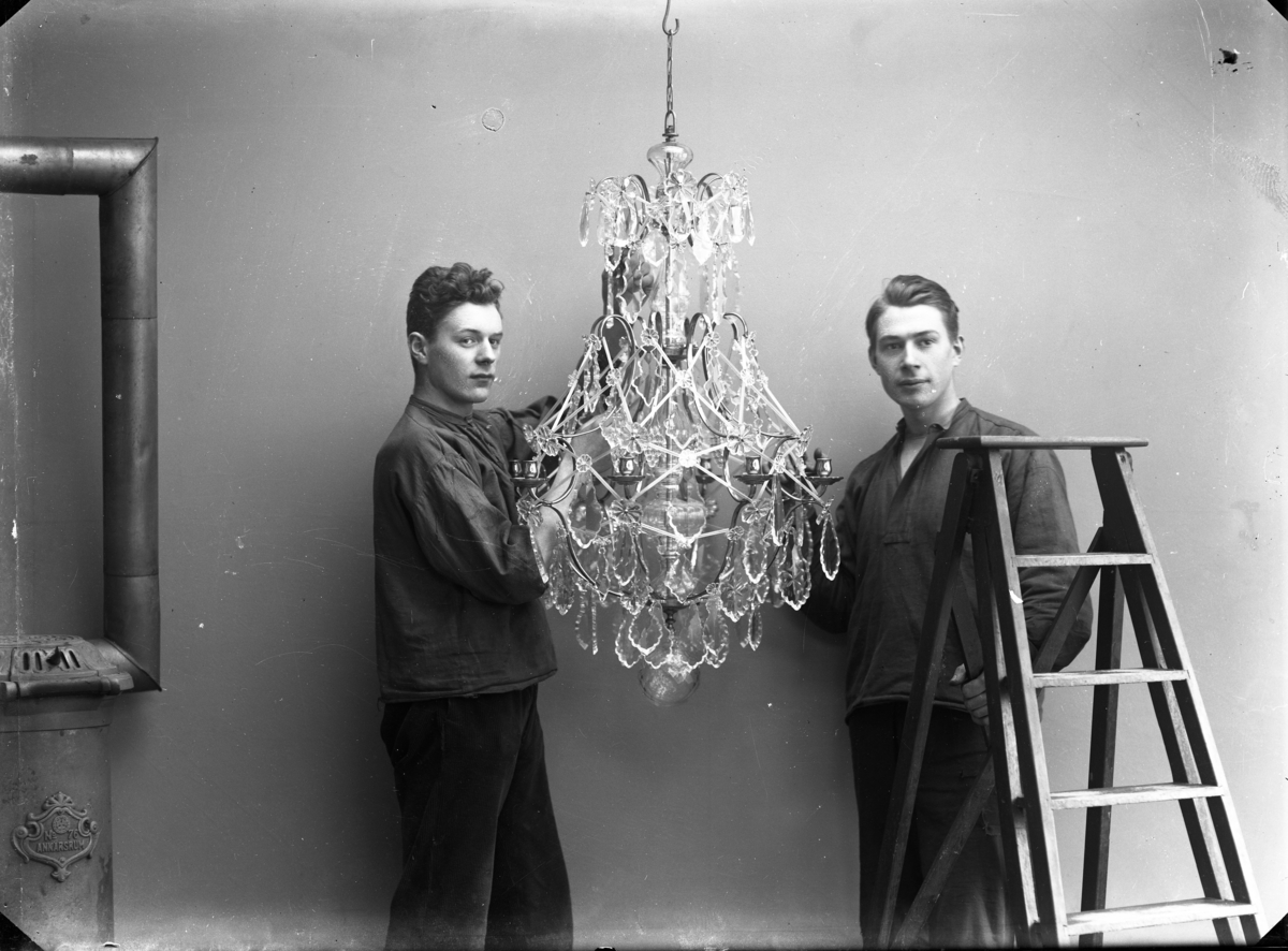 Två män vid en kristallkrona på Bollings ljuskronefabrik.