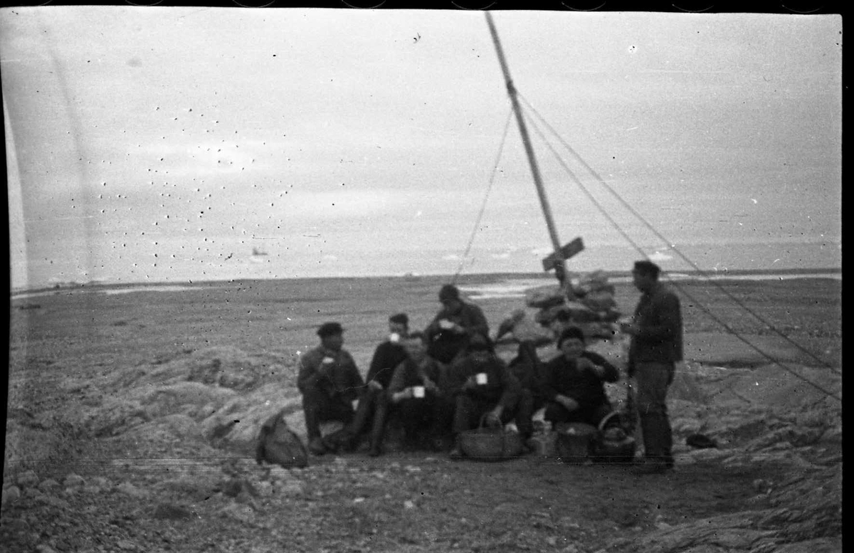 Fika vid Horns varde som markerar fyndplatsen av Andréelägret på Vitön. Stubbendorff till vänster.