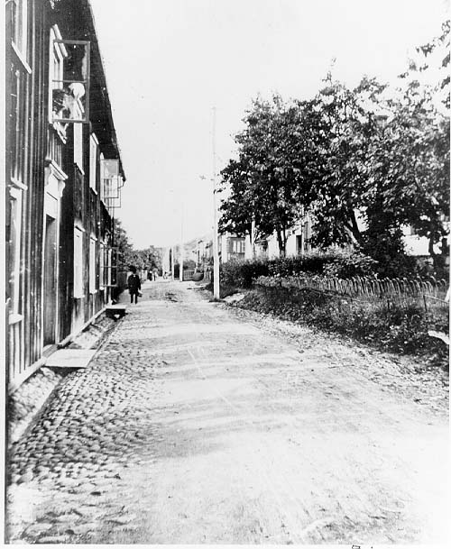 Bergsgatan söderut. Till vänster en sannolikt förfärgad tvåvåningsbyggnad med locklistpanel. Enstaka fönster är öppna och ur ett på andra våningen tittar en person ut mot norr varifrån en man i mörka kläder, hatt och väska i handen kommer gående. Till höger höga fruktträd som skymmer nr 42-46. Gatan är belagd med kullersten.