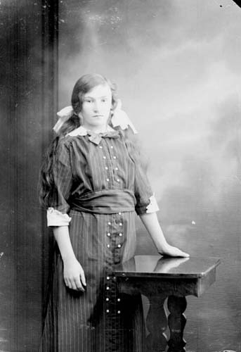 Porträtt av en flicka som står vid ett bord. Hon har hästsvans med rosetter i håret.