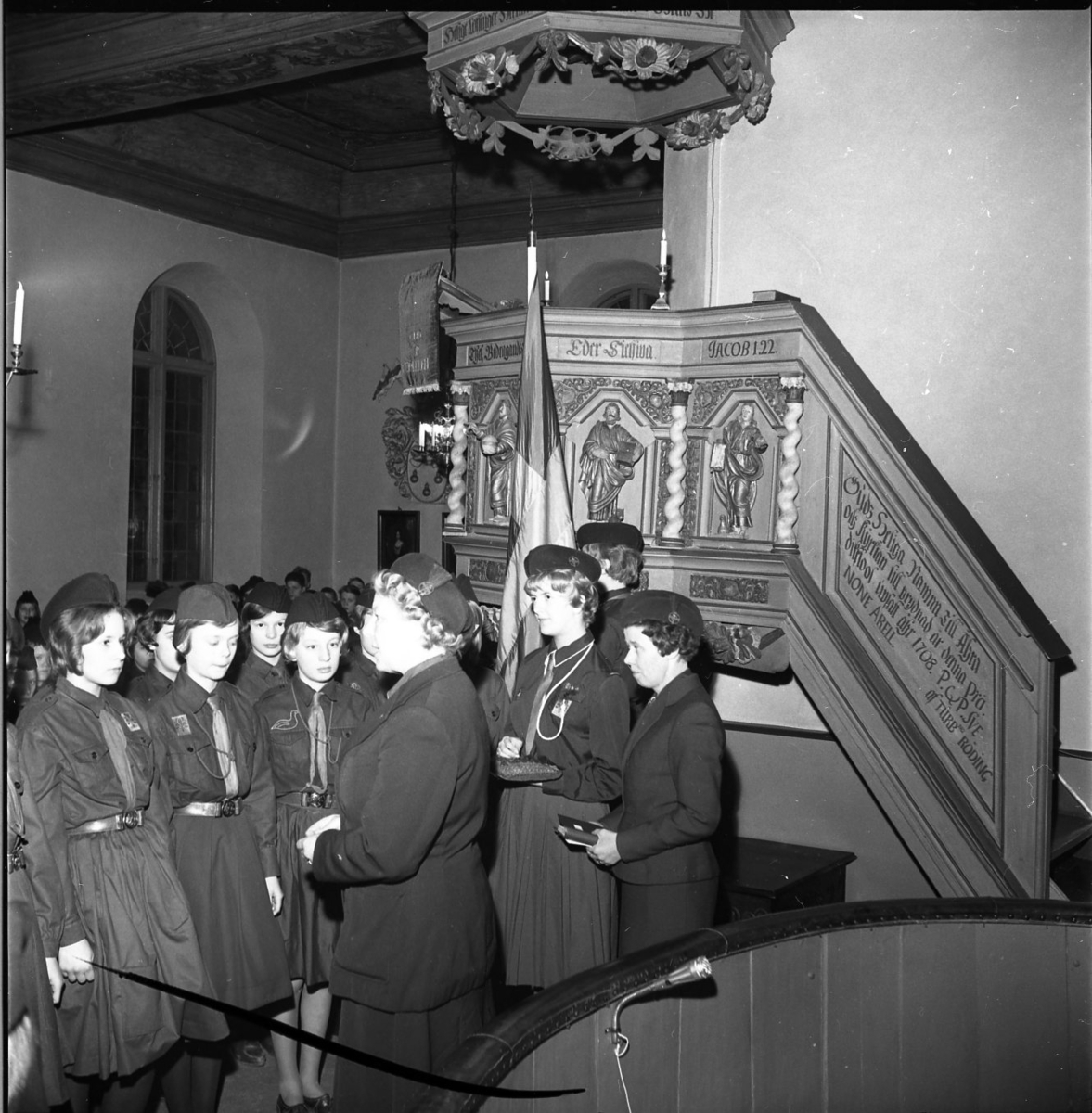Scouter uppställda på led framför en scoutledare. De befinner sig i kyrkan.